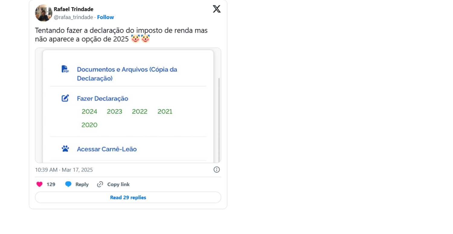 Usuários recorreram às redes sociais, especialmente ao X (antigo Twitter), para relatar problemas. Entre as principais queixas, está a ausência da opção de preenchimento e envio da declaração no site e no aplicativo, permitindo apenas a transmissão de retificações de anos anteriores.